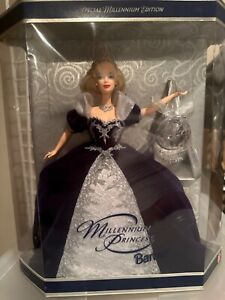 eBay This "Millennium Princess" Barbie doll is a special edition from the year 2000 and is brand new in its original, unopened packaging. The doll features blonde hair that can be styled into either wavy or straight locks, as well as blue eyes and a light complexion, giving her a classic Caucasian appearance. Made from plastic and fabric materials, this fashion doll is part of the Barbie franchise from Mattel and is recommended for ages 6 and above. This doll has not been personalized or signed, and is an original, licensed reproduction. It comes from a virus-free, smoke-free environment, making it a great addition to any Barbie collection. The doll's packaging is in excellent condition and has been well-preserved over the years, making it a rare find for collectors. (Condition: Brand New)